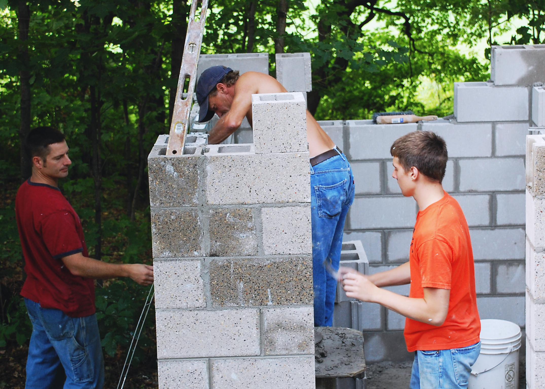 Jesse designed the smokehouse to have glass block windows to allow in natural light. Laying the glass block was the most time-consuming part of the block laying process and the expertise of Jesse’s uncle was definitely necessary to get the glass blocks set just right. Our son worked on smoothing the joints between the blocks.
