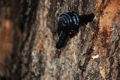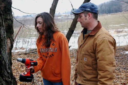 We located more maple trees on higher ground behind the house and drilled new holes for the taps.