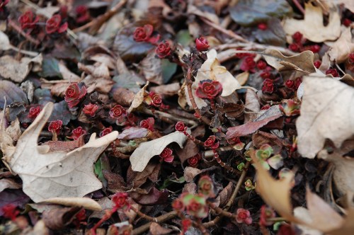 The last few warm days have brought other perennials out from their winter sleep.  Seedum and Ajuga intertwine here.