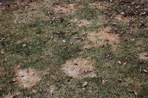 In contrast to the healthy green lawn that she graces above, is the spotted lawn that appears every spring.  This spring is no different, and we will need to re-seed these areas.