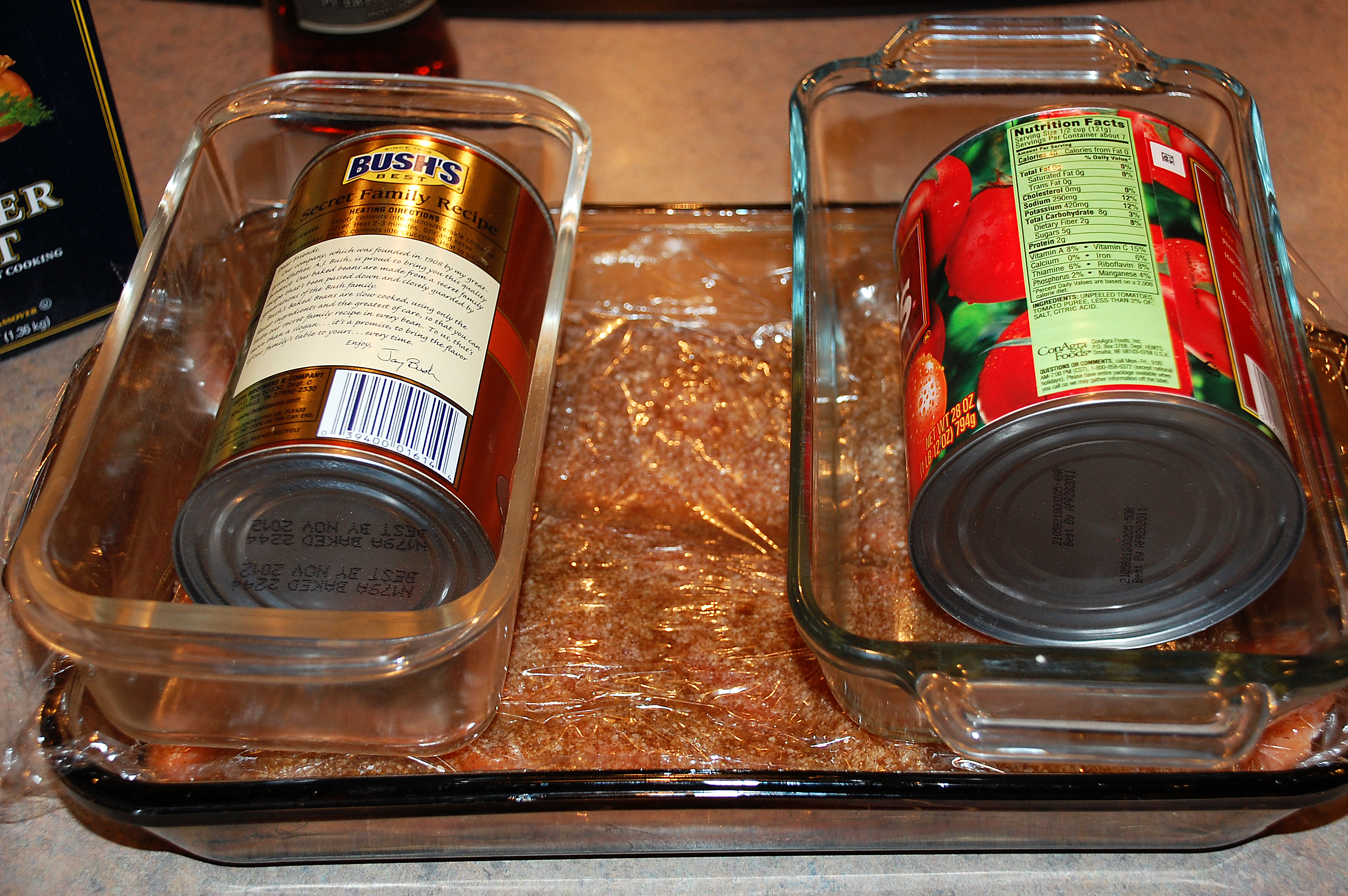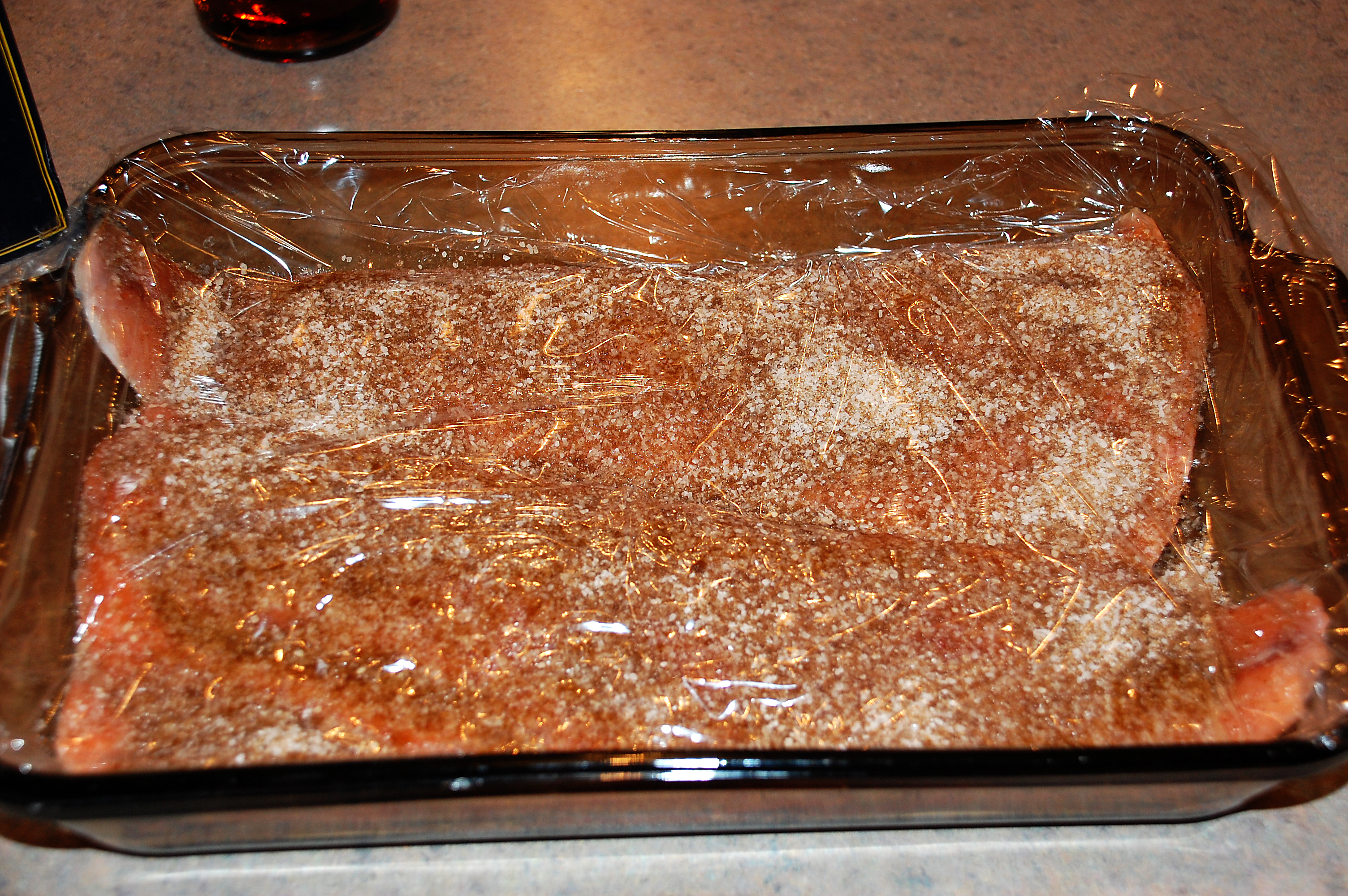 Place a pan (or pans) on top of the salmon and put some type of weight in it to help extract the moisture.  We used cans and a dressing bottle in between for weight.
