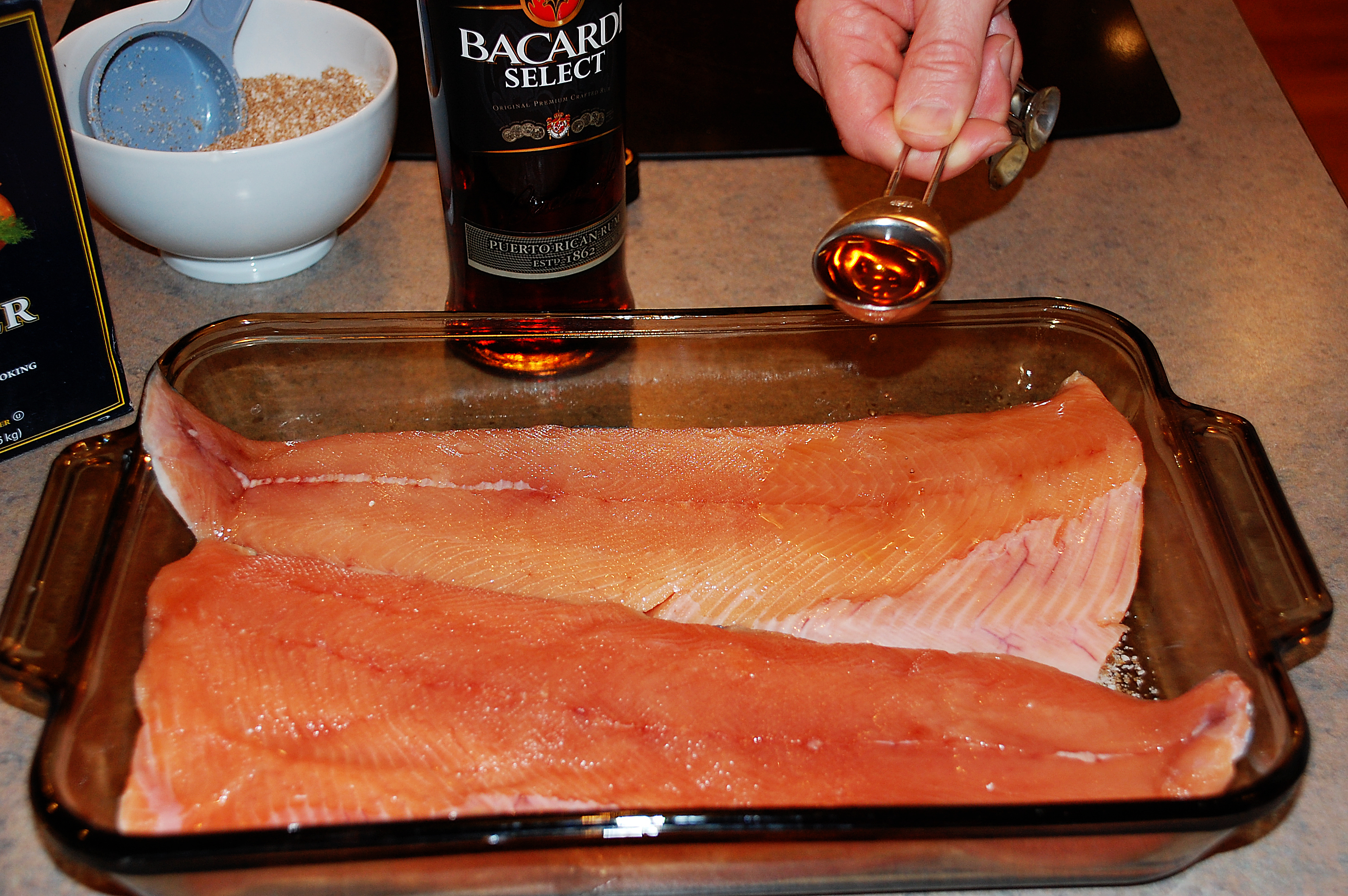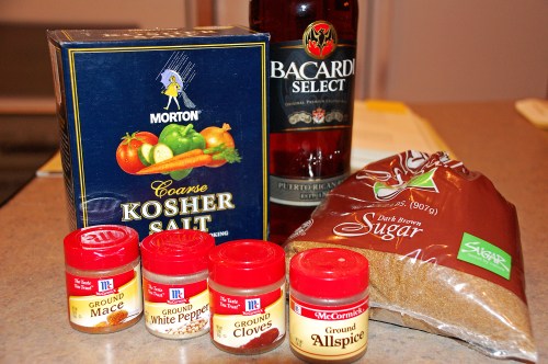 Time to sprinkle on the dark rum and add the rest of the dry cure mixture over the top. Make sure to sample the rum during this part of the process to make sure it is of good quality.