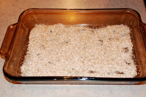 After mixing all the dry cure ingredients together, spread half of the mixture out in a dish or pan.  It is helpful to choose a dish that is around the same size as the salmon fillets because the curing process extracts liquids out of the fish.  Having a dish around the same size allows these liquids to remain in contact with the fish and becomes a natural brine for curing.