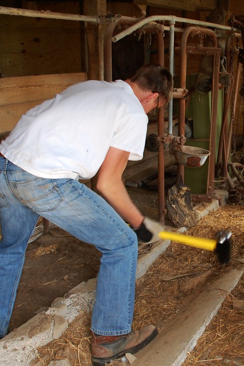 Because the pipes were all rusted together, the only way to remove them was with brute force.  Jesse is out of town for work for two weeks, so our oldest son took on the task and busted the concrete out that held the stanchions with a sledgehammer.