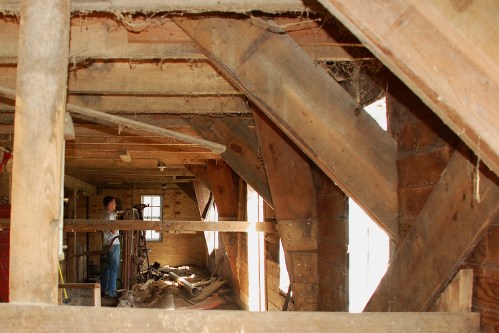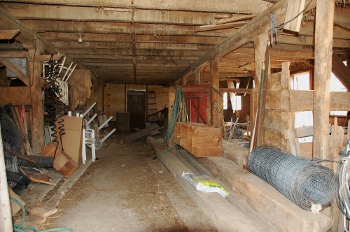 Along with all the miscellaneous lumber and junk, the old cattle stanchions stand in the rear of the barn from the days when it was a functioning dairy barn.