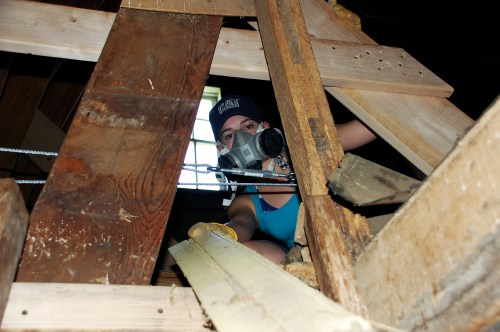 Being the good mother that I am, I told my daughter that she would have to go up in the loft and I would hand the boards to her for stacking.  I explained to her that I would get both of us hats to avoid any possibility of the old wives’ tale about bats getting caught in a woman’s hair coming to fruition.  I’m not sure, but I think she felt reassured.