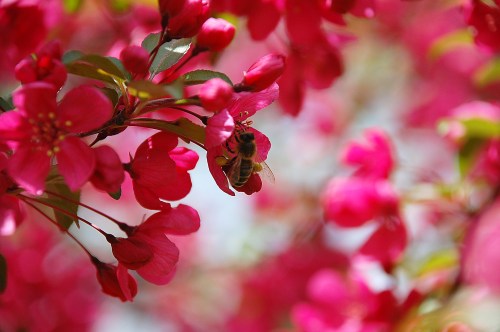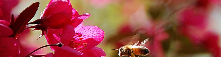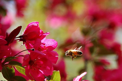 Of the numerous pictures I took of the bees buzzing around the crabapple tree, this one is my favorite. It captures the determination of the worker bee, with her beating wings and her loaded pollen baskets heading in to work another blossom.