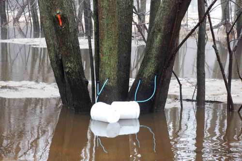In preparation for collecting sap, we placed our pails safely next to the maple trees in the backwater area of the river.