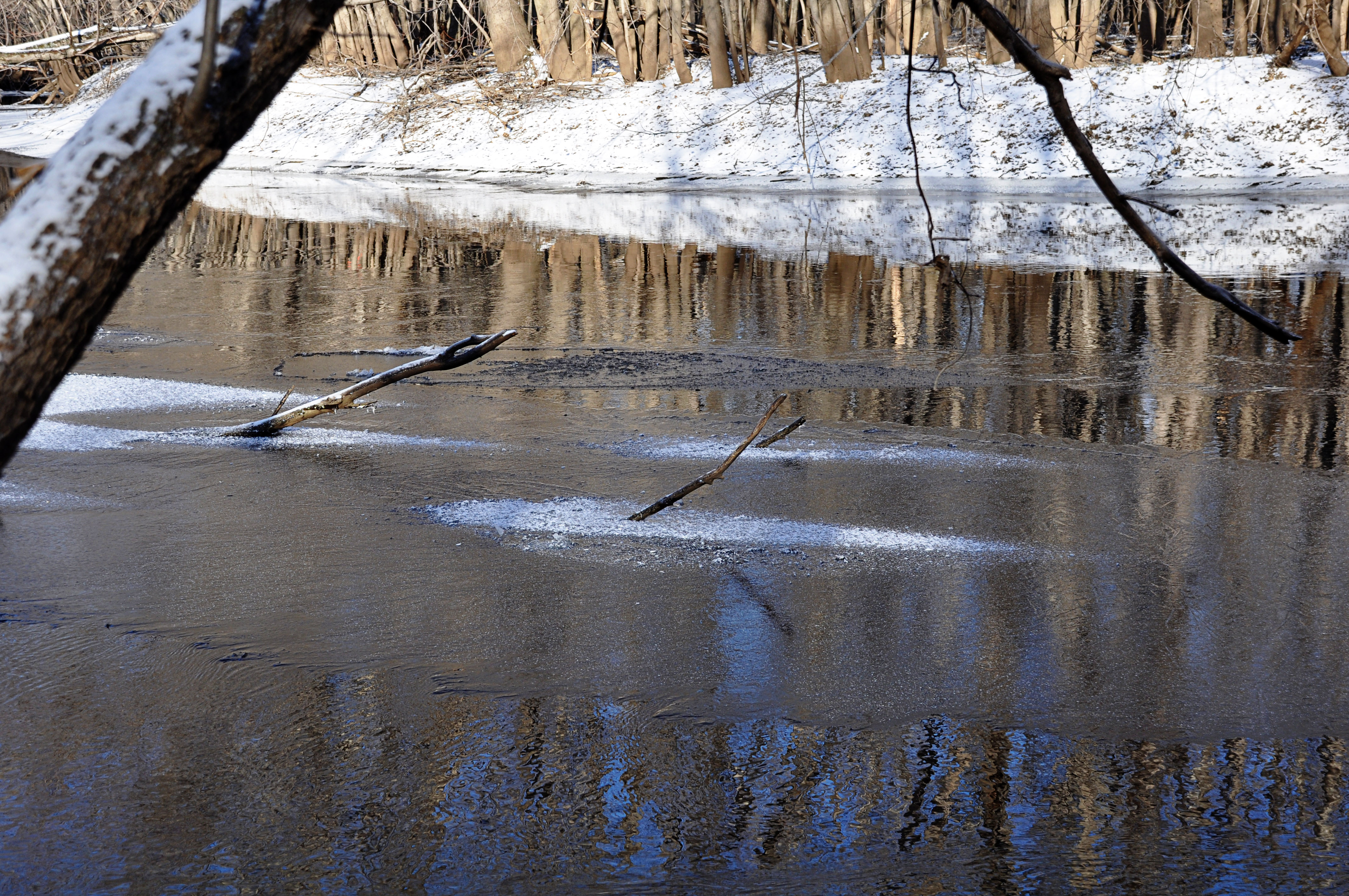 The colder temperatures have caused ice to form on the slow-moving backwater of the river.