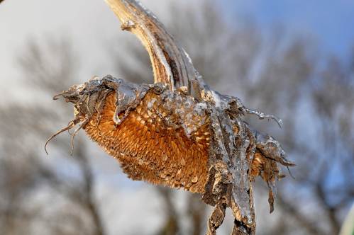The already heavy sunflower heads drooped further under the added weight of the ice.