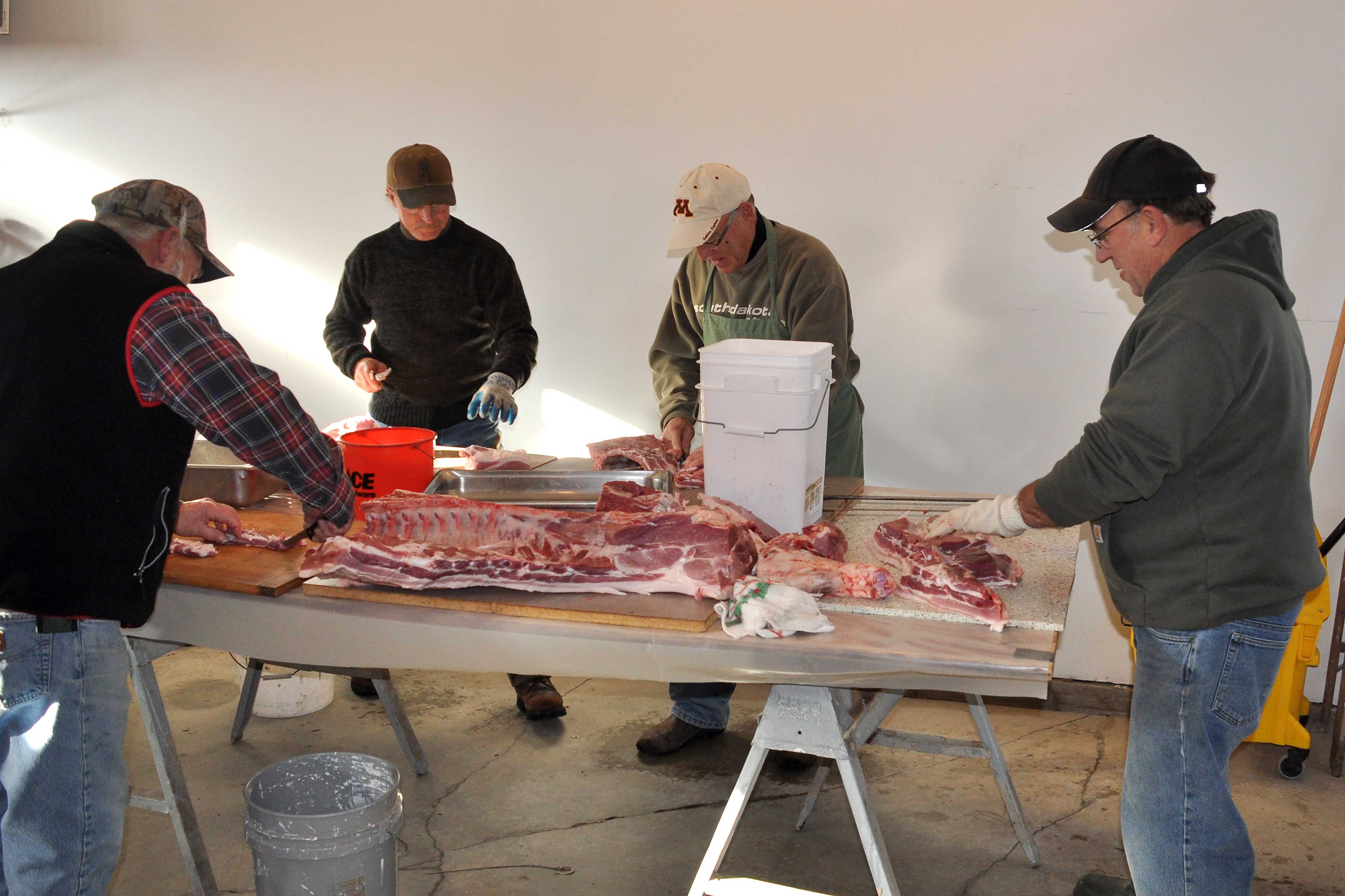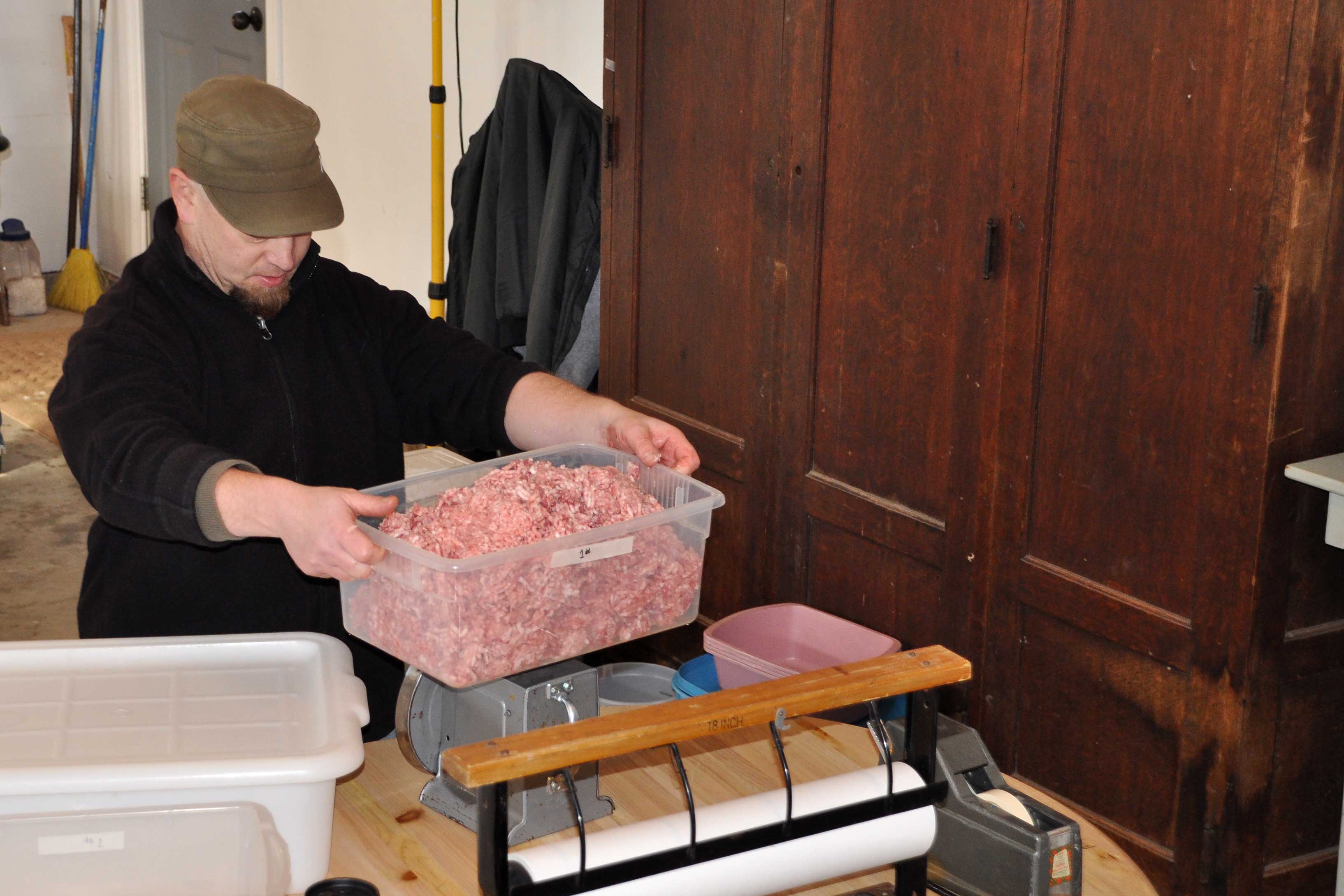 As the meat is cut off the bone, the chunks of meat from each table are moved over to the grinding area. A few years ago, the family purchased a 1.5 horsepower commercial grinder to improve the process. It has been a great addition to the sausage-making equipment.