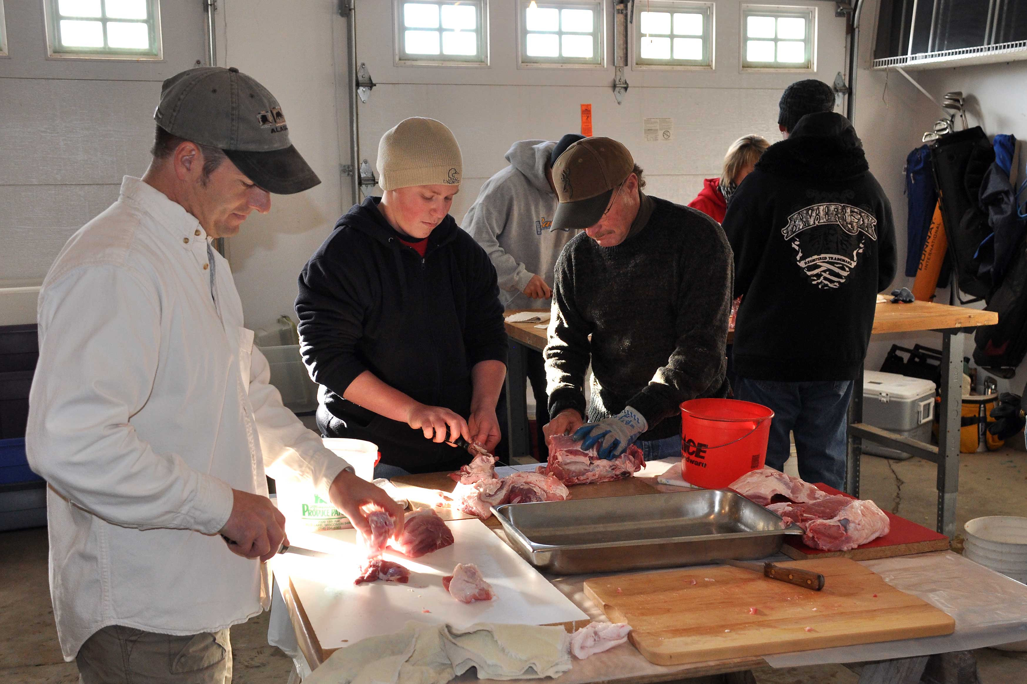 Once people start to arrive, the cutting begins. The hogs are cut into sections and the people cutting are given sections from both the front and rear quarter for cutting. The idea is to get a good blend of the different cuts of the hog, mixing together both the premium and more standard meat. The meat is cut off the bone into cubes or chunks for grinding. We had three tables set up for cutting.