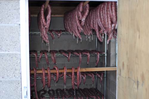 The sausage is hung in the smokehouse to dry overnight to form a pellicle. The pellicle refers to the tacky surface that develops when food is dried and to which the smoke sticks, thereby adding the desired smokey flavor.