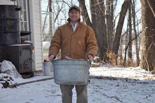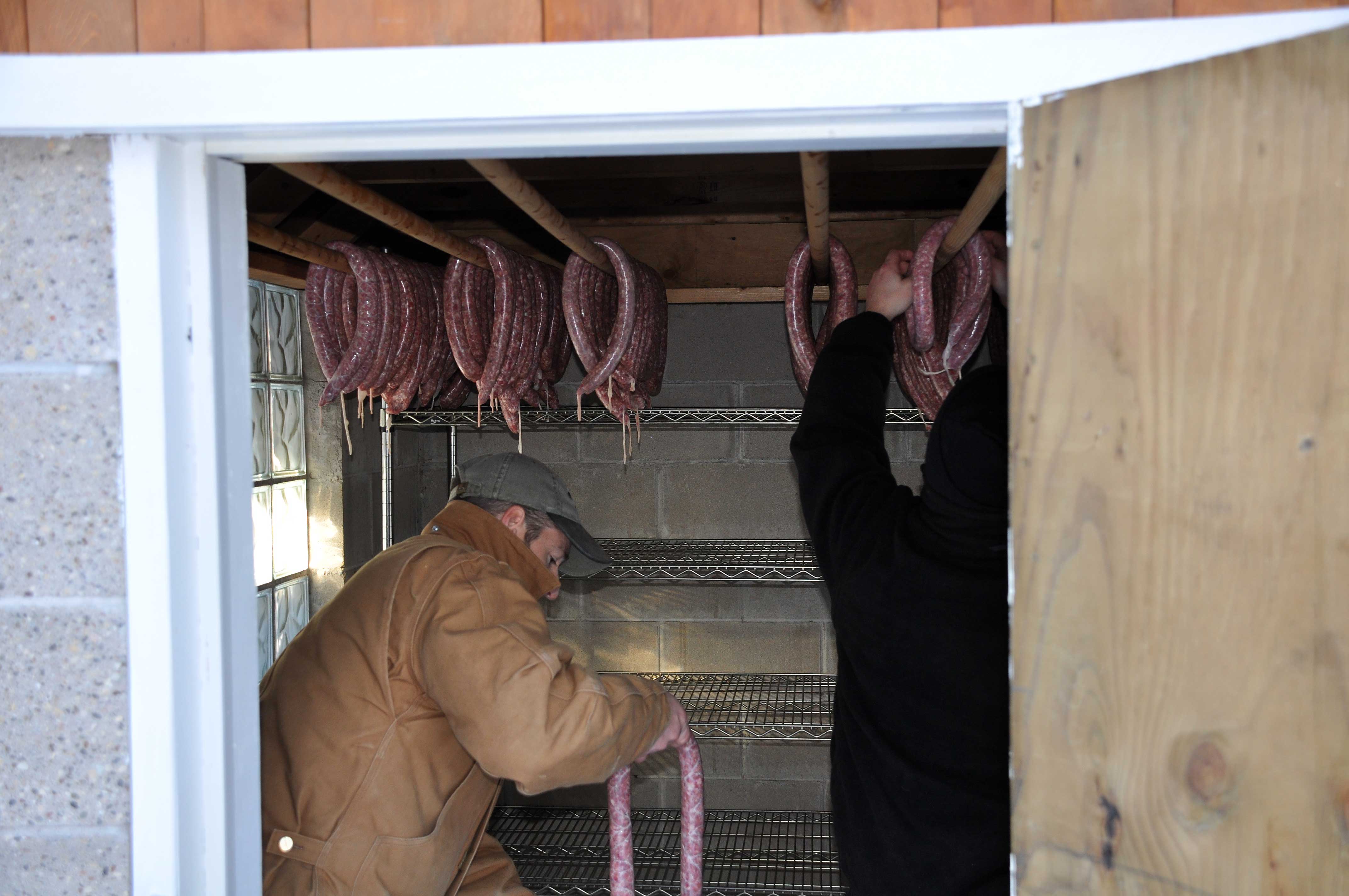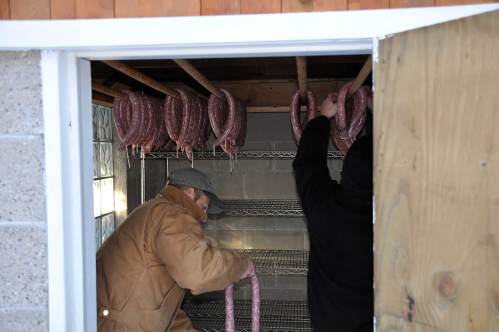 The 300 pounds of link sausage is carried tub-by-tub out to the smokehouse and placed on racks for drying.