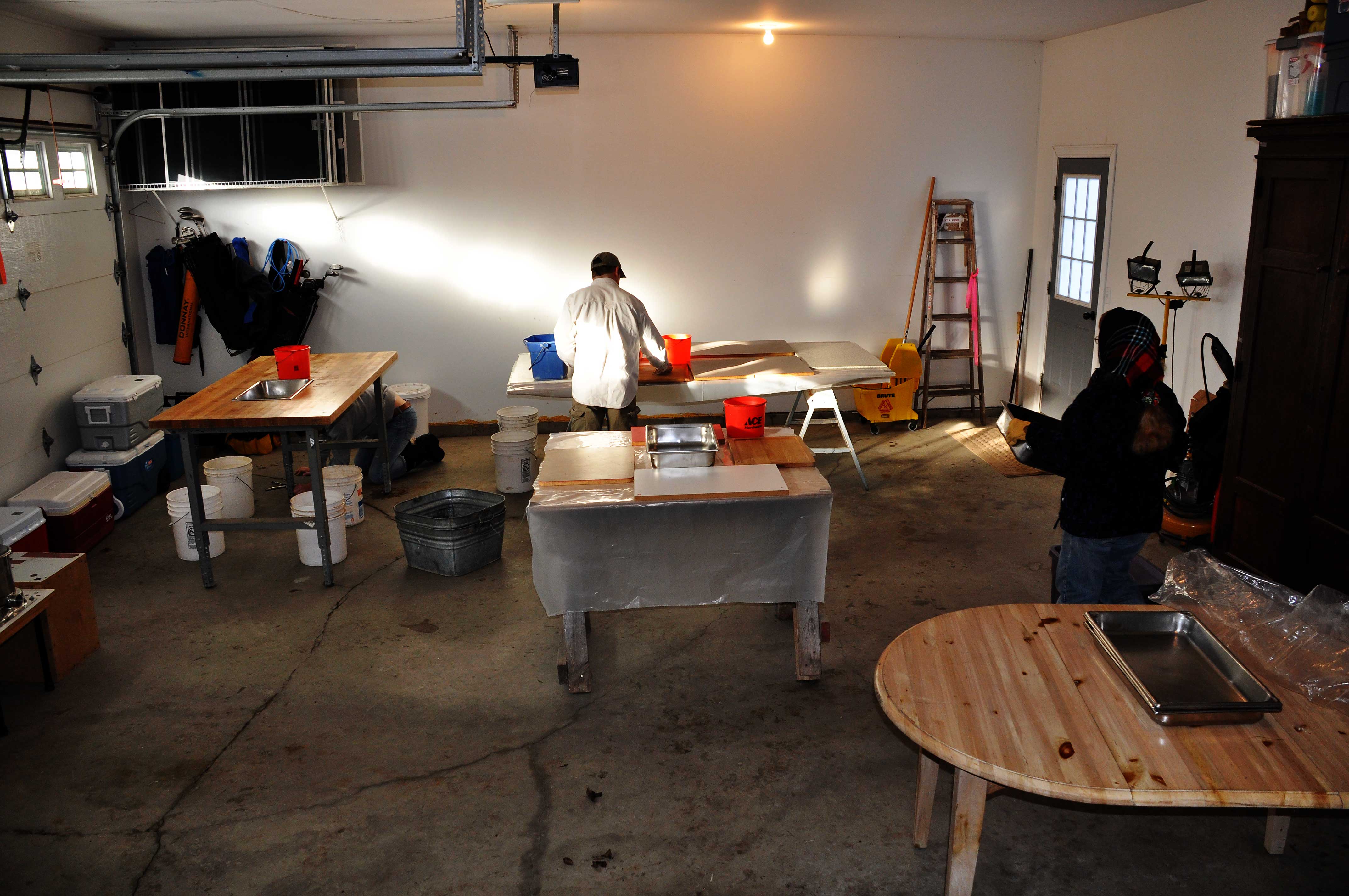 We hosted this family event at our house again this year. The preparation process is a long one and requires completely cleaning out our garage, mopping the floors with bleach water, hauling equipment in from various storage locations, and setting everything up. We place clean plastic on all the tables and wipe them down with bleach water. Cutting boards, knives and containers are also washed. We do all this prep work on Thanksgiving evening, so it helps us work off that big turkey dinner.
