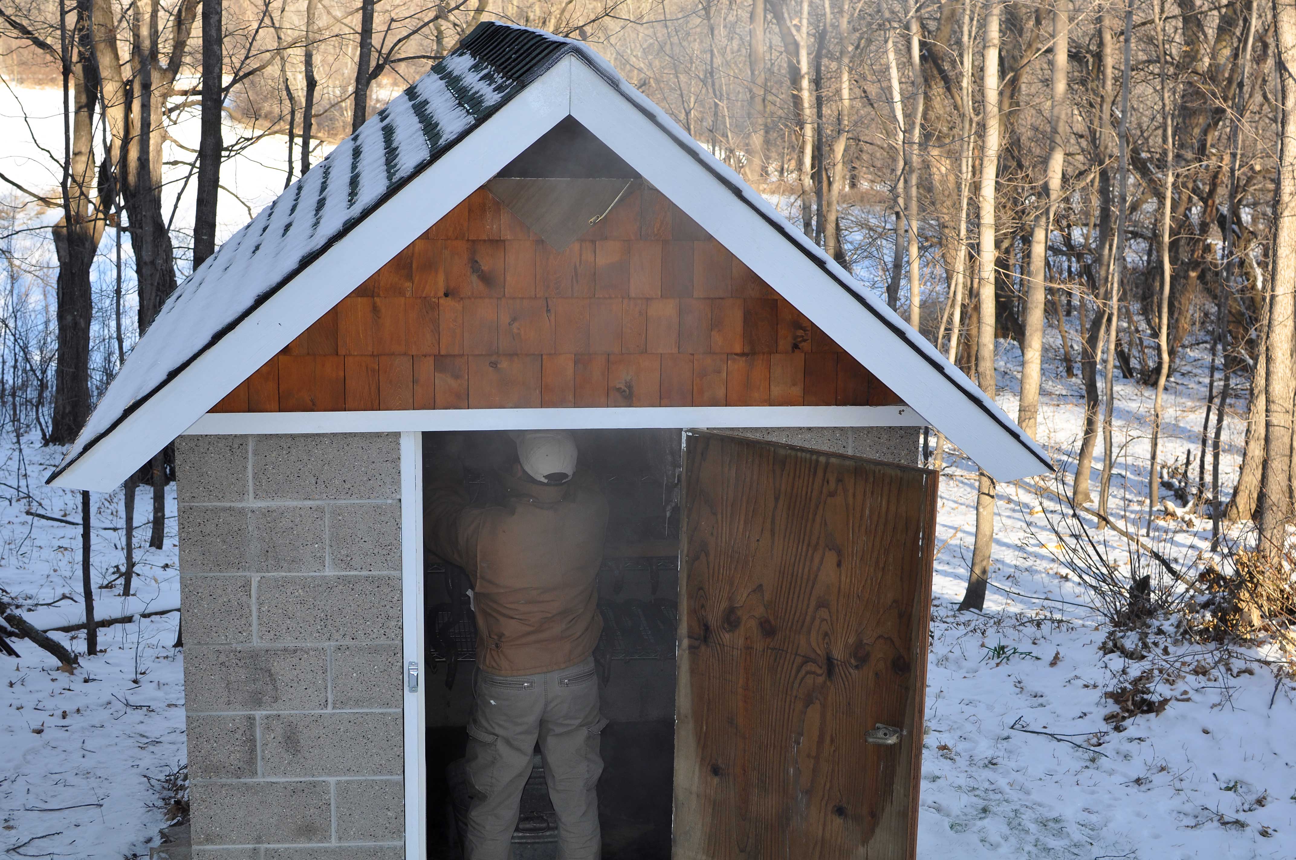 Early the next morning, Jesse fired up the smokehouse to start the cold-smoking process. The art of cold-smoking is to keep the meat below 70 degrees F to inhibit bacteria growth and to not cook the meat. (Refer to this post about building our smokehouse for more information on how our smokehouse works).