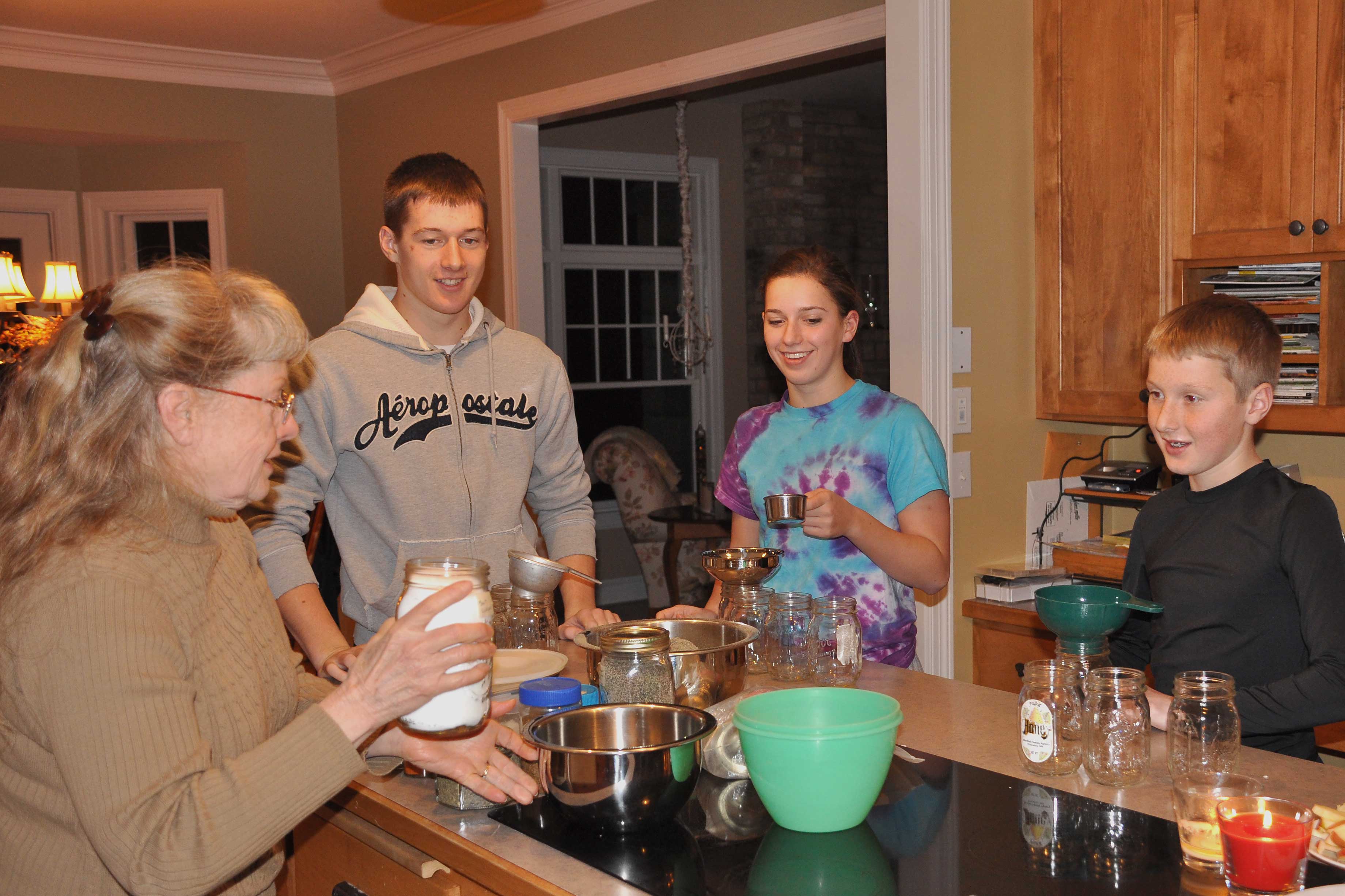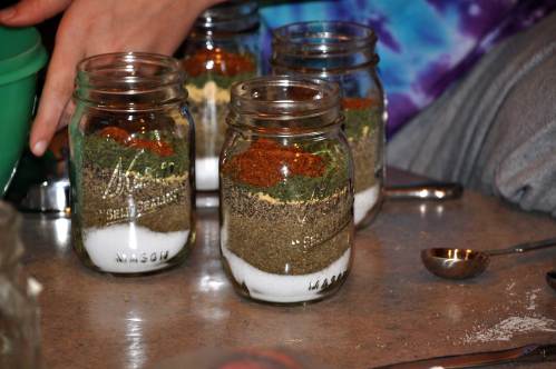 In addition to the cleaning and setting up, another important preparation that we do the night before is to mix the spices. My mother-in-law purchases all the spices, mostly in bulk, and works with our three kids to measure them out into pint jars. Each jar is enough spices to season 30 pounds of sausage. The kids stand in a line and she gives them the measurement and they pass each ingredient down the line, placing the correct amount in the jars in front of them.