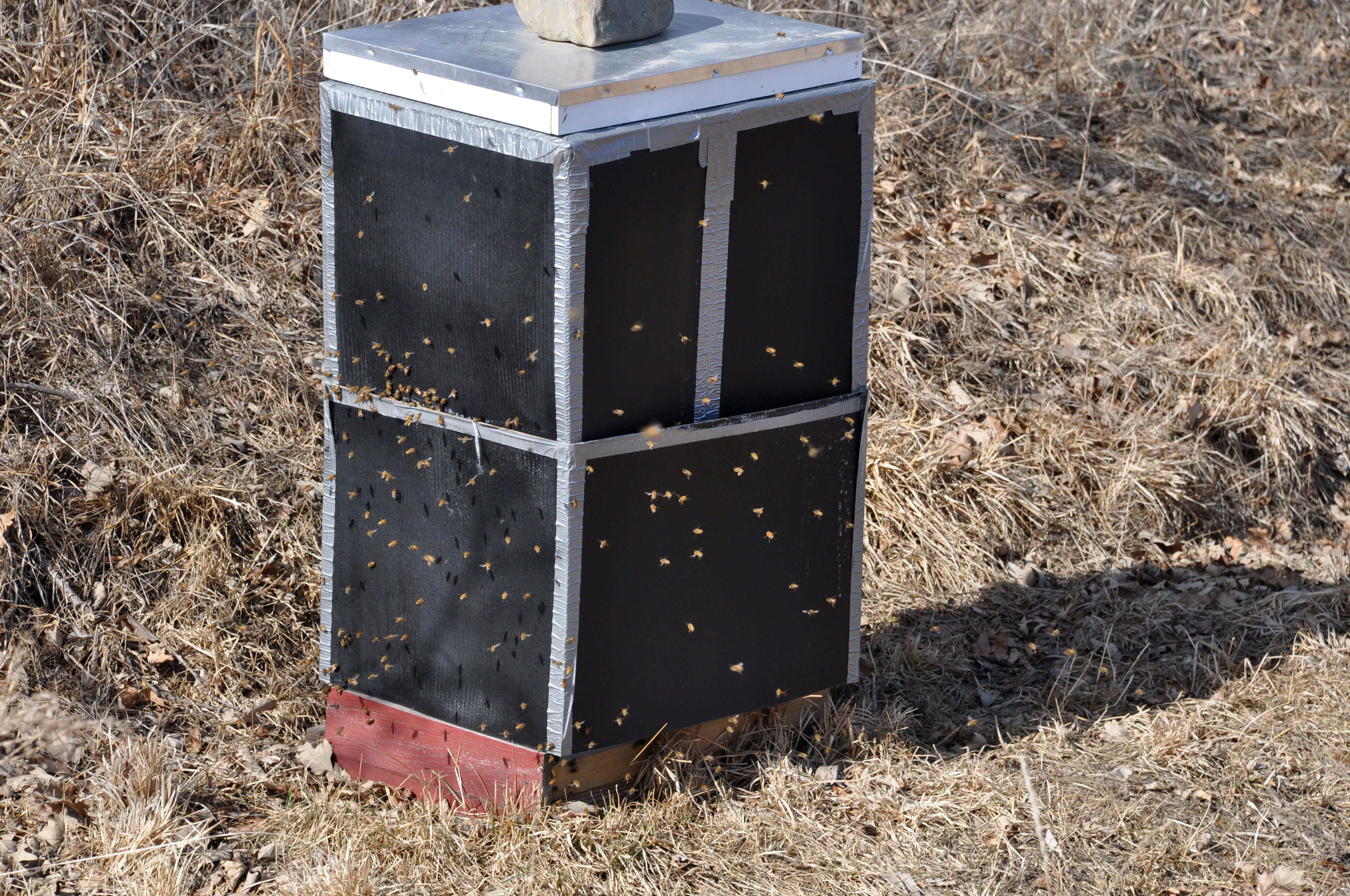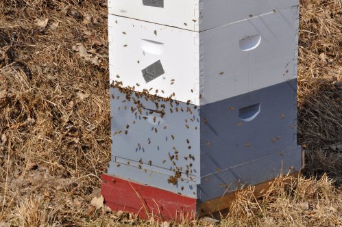 Since they are active so early this year and there is little food supply available yet, Jesse decided to start feeding them some sugar syrup to get them through the next month or so. He also took off the black winter hive covers because of the warm temperatures – we don’t want them to cook in there! The hives both seem really strong, so we are excited to see how this season turns out.