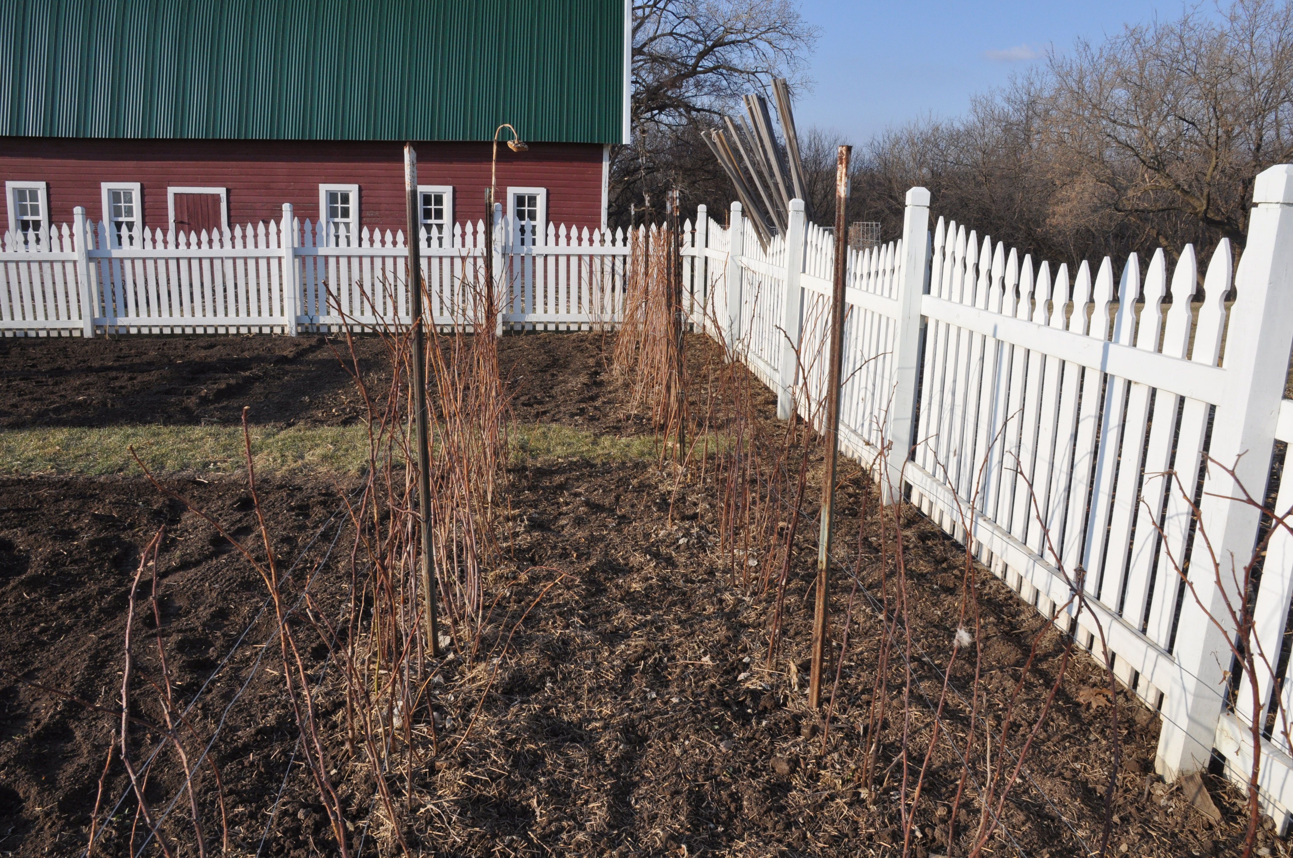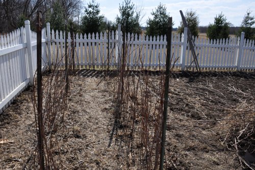 We then trimmed all the remaining canes to about chest height, applied a 10-10-10 fertilizer, and lightly tilled along the sides of the rows. When we get around to it (hopefully within a week or two), we will put down a chopped straw mulch to try controlling weeds.