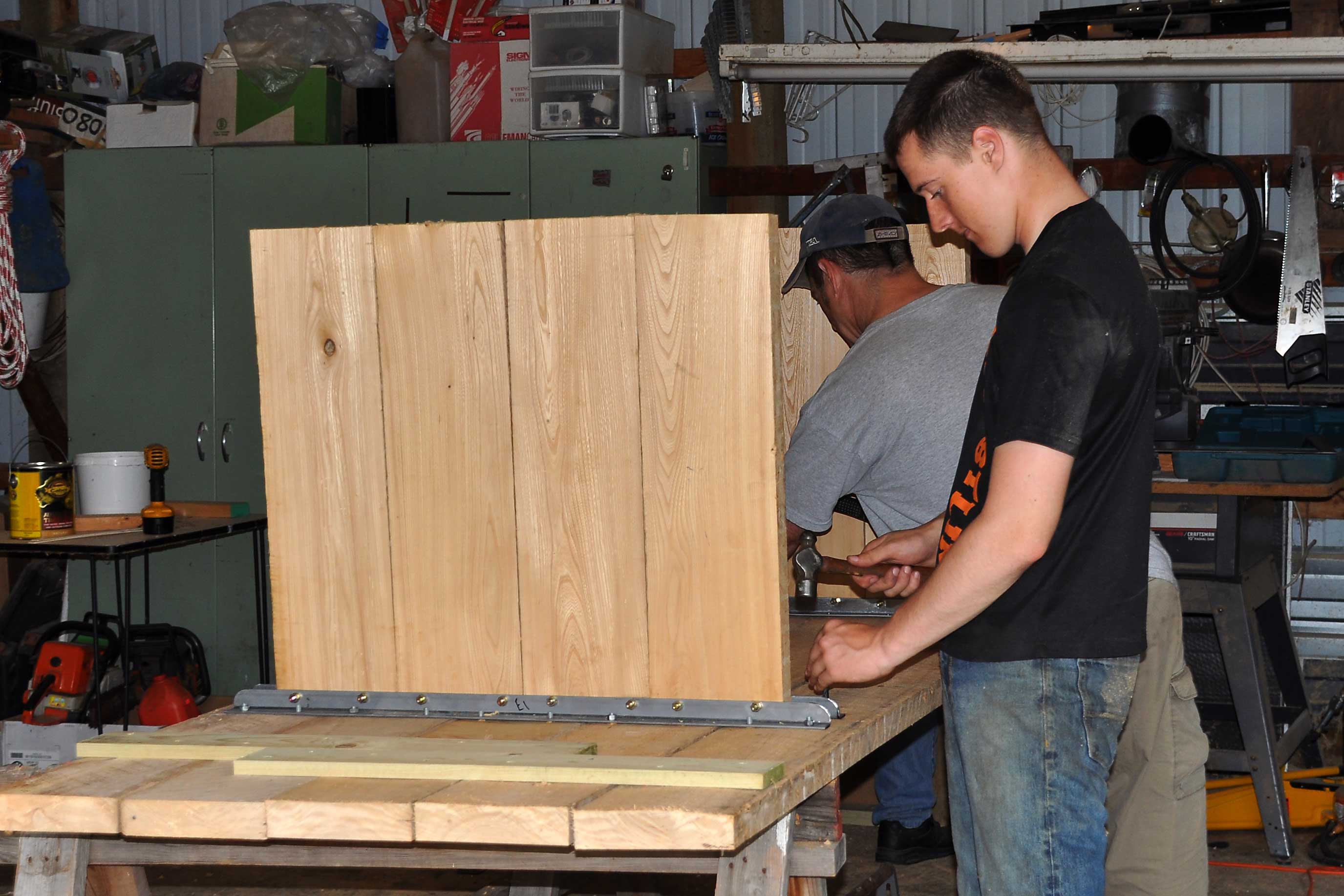 DSC_0027Once the boards for the table top were planed and cut to the proper length it was time to work on the structure that would hold everything together. The guys decided that 1 1/2 in. angle iron would provide the proper strength and be consistent with the rugged appearance. Our son started to measure, mark and drill the holes in the angle iron that the carriage bolts would be bolted through.
