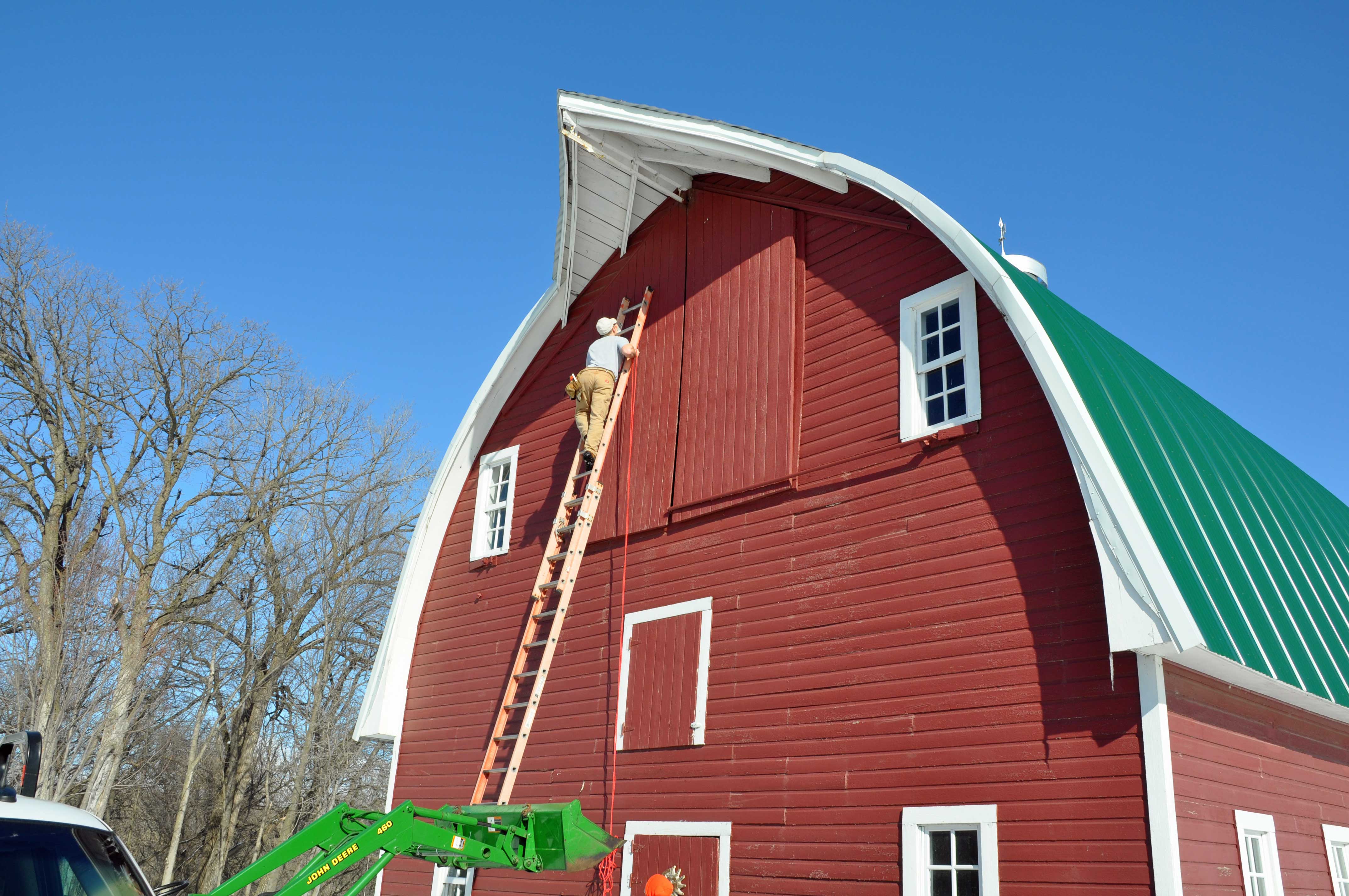 Our research indicated that to have the best chance for relocation, the new bat house should be located as close as possible to the current bat entrance. Well, that would be high up in the peak of the barn. The extension ladder wasn’t quite long enough, so in typical farm fashion, I placed the ladder into the bucket of the tractor. This type of work isn’t for everyone. We did luck out and it was a glorious warm sunny date for February. Even warm enough to wear a short-sleeved shirt!