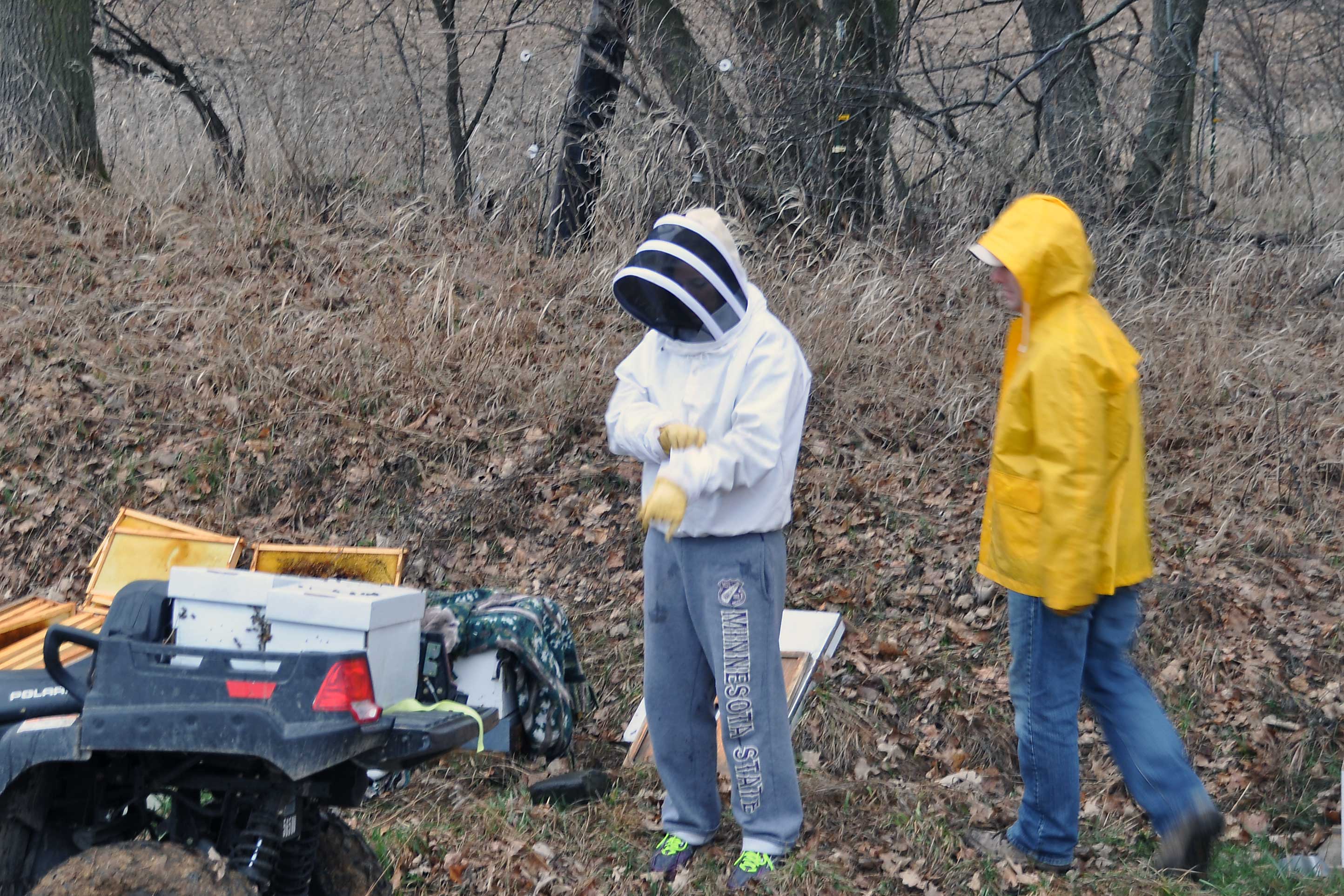 The bees were very riled up and it was a little scary, so I did not stay too long to photograph. I don’t think they enjoyed the ride across the plowed field in the back of the 4-wheeler, even if it was a slow one. 🙂