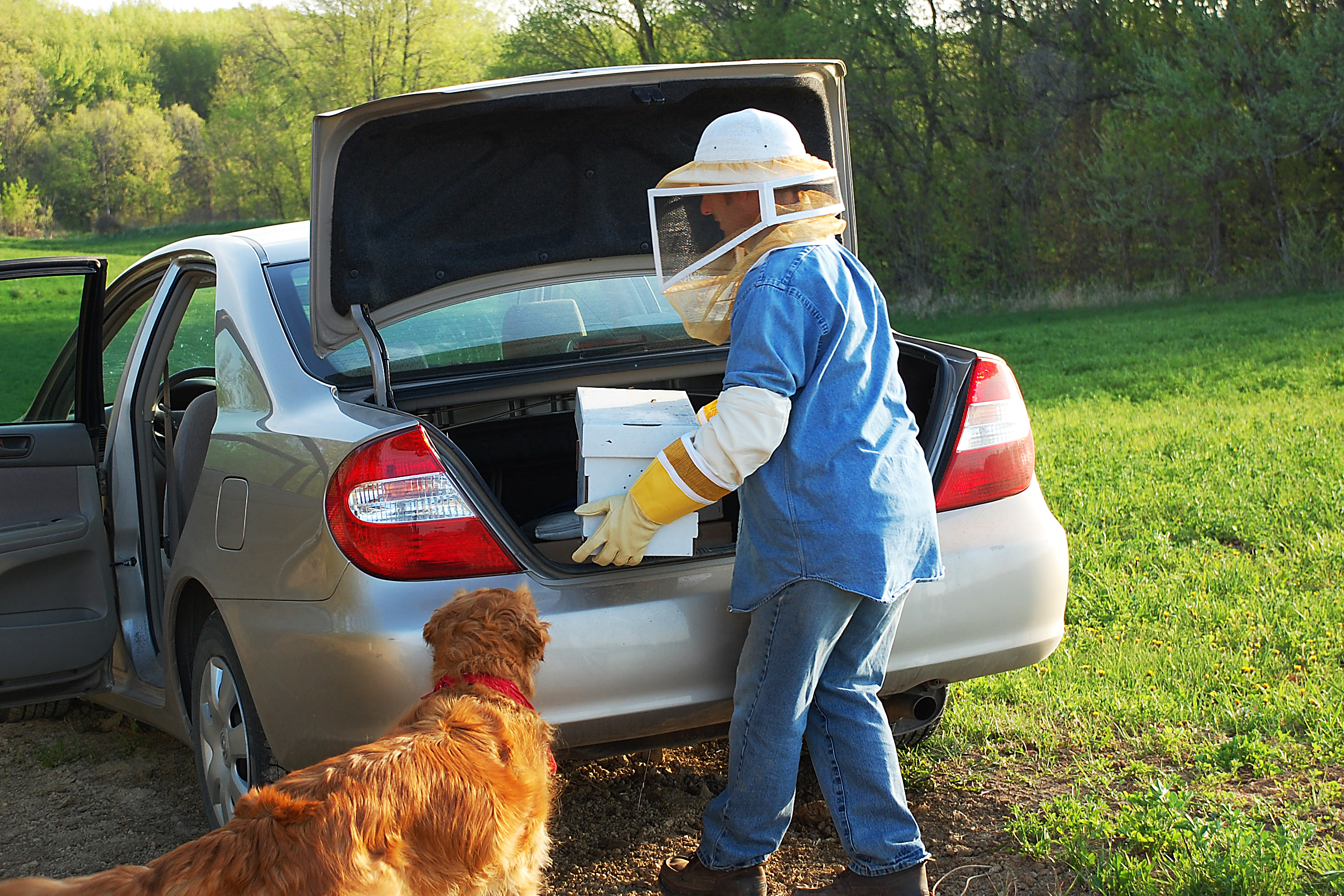 One evening in early May we received a phone call from our bee supplier.  He informed Jesse that the bees were arriving on a truck later that evening and that he should be there before sunrise to pick up and transport the bees to their new home.  Arriving just before sunrise, Jesse loaded the box containing the nuc into the trunk of the car and headed home.  Other than a few escaped bees flying around inside the car with him, his drive home with the bees was uneventful.  Jesse had everything set up and ready for the bees.  Being the picture-taking maniac that I am, I was there to document his arrival with the bees.