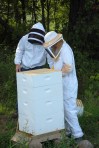 Sofie was also there to watch Jesse with the bees.  She insisted on sniffing the box and was snapping at the bees flying around outside the box.  Her curiosity and aggression made her the first and only victim of a bee sting during the summer.
