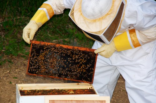Jesse carried the box with the nuc over to the hive and placed it on the ground next to the hive.