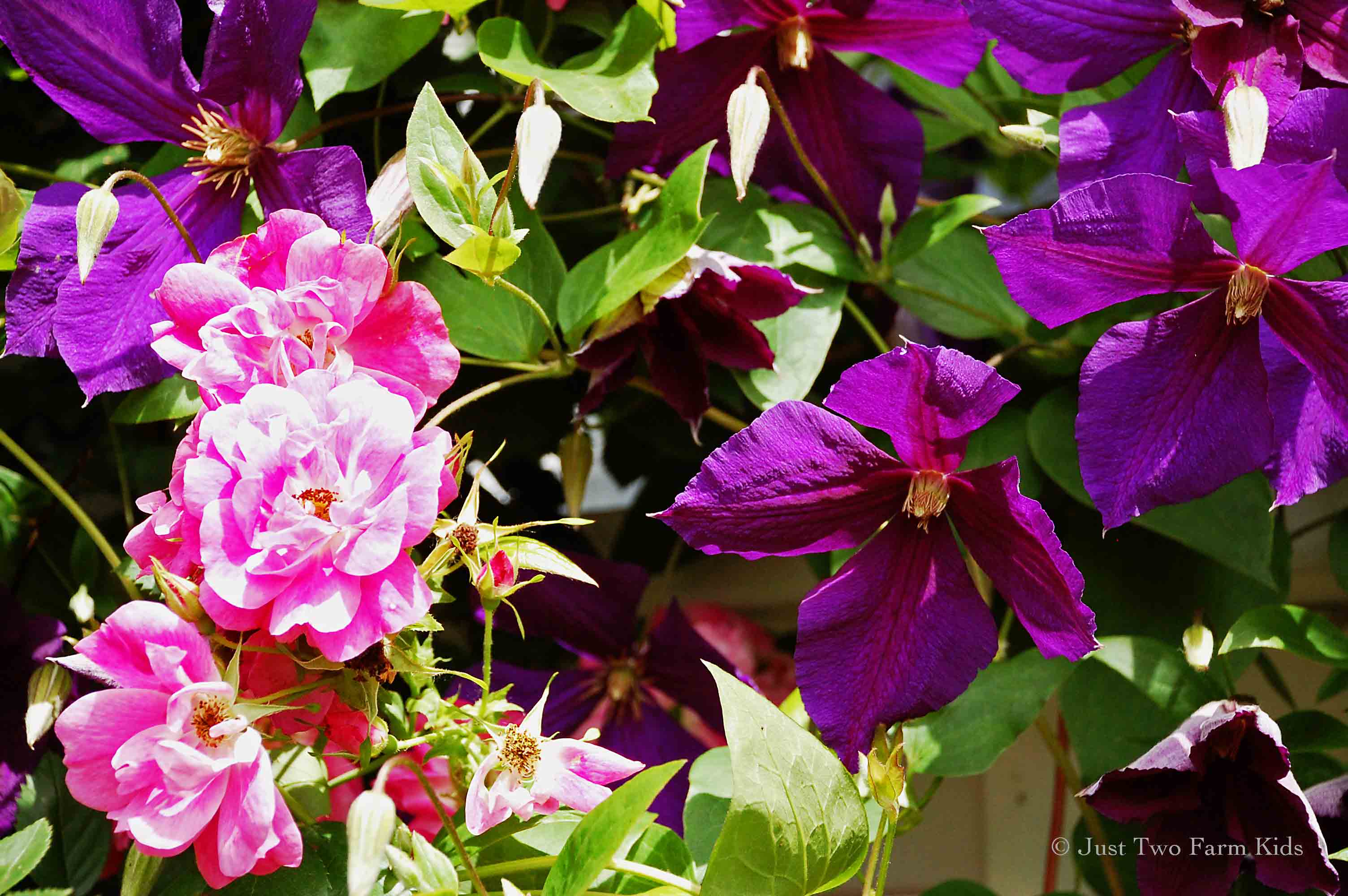 My climbing roses were absolutely stunning this year. I have four William Baffin climbing roses:  two climbing up the porch and two on an arbor by the vegetable garden.