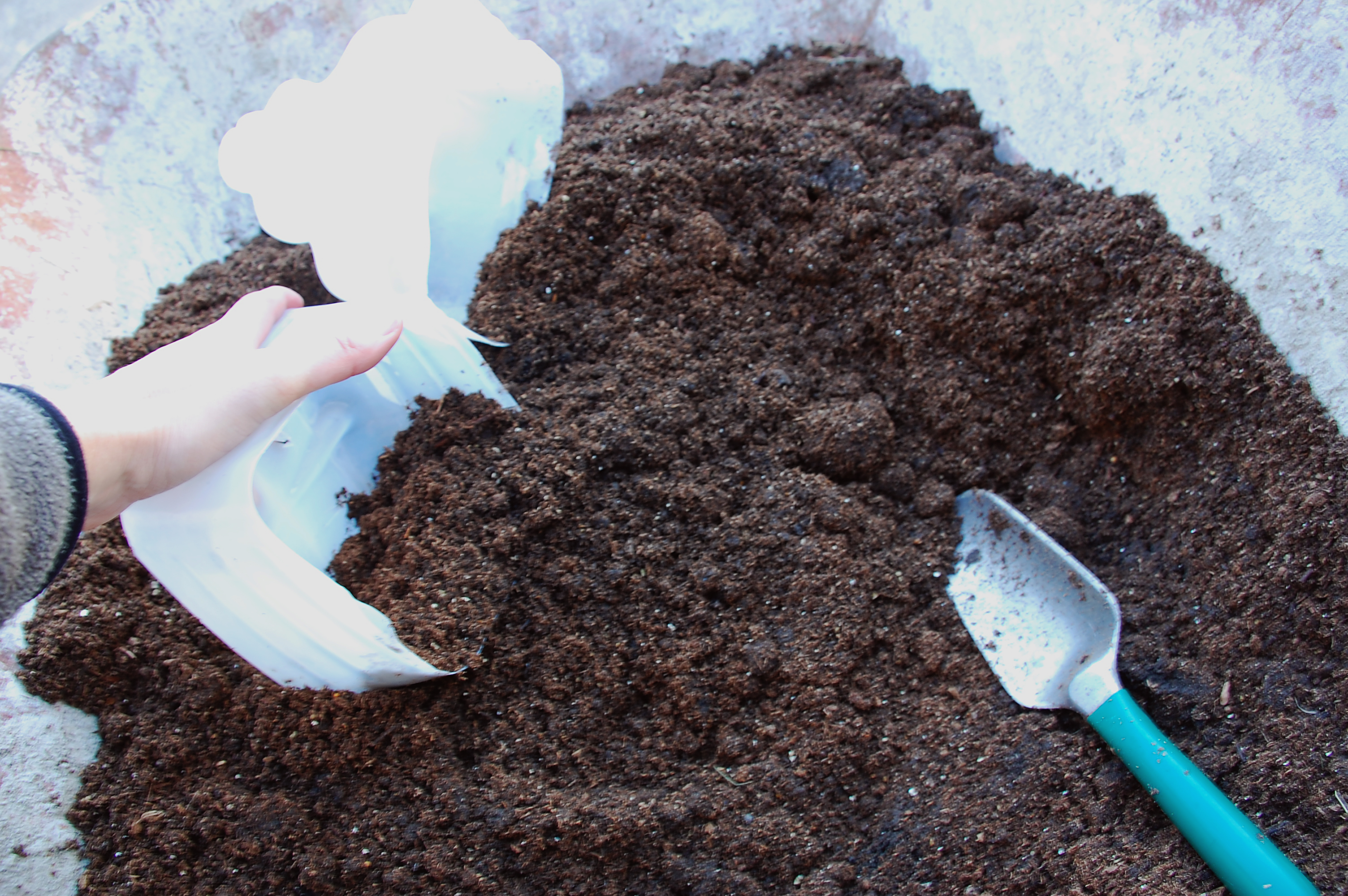 Using a mixture of equal parts seed starter mix and potting soil, I put 3-4 inches of dirt in each container.